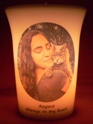 Mourninglights™ are 3 1/2" tall candle holders of white milk glass custom printed with ceramic inks that will not fade or yellow even in direct sunlight.